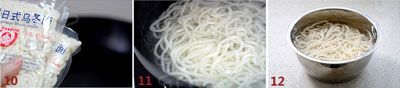 下乌冬面用筷子搅散水开后大火煮半分钟,捞出立即过凉水,晾至室温沥水备用。