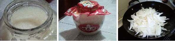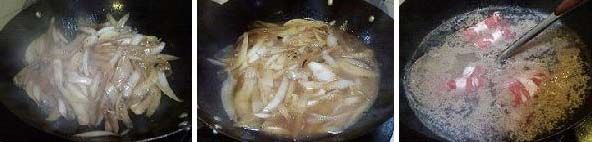 在一个小碗内倒入红酒、盐、鸡精、酱油,少量水、糖都溶化,一起倒入糖浆,变成黄色时倒入上一步调好的汁和洋葱丝;。