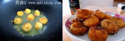 放入油锅,中火煎炸至金黄。在炸好的团子上淋上些糖浆。