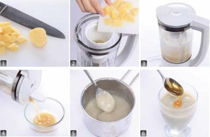 将土豆去皮洗净后,切成大块。放入食品加工机中搅碎,滤出汤汁。