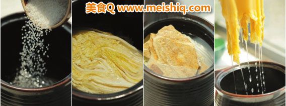 白菜一棵棵一层层转圈摆好摆实,菜与菜之间不留空隙,一层菜一层盐撒匀,盐的用量为白菜重量的 1/50,摆好之后在最顶层白菜上放压缸石。