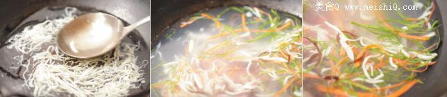 烧沸后,撇去浮沫,加盐、胡萝卜丝、火腿丝、木耳丝和蔬菜丝稍烩一下,即可出锅倒入汤碗内,淋入鸡油即成。