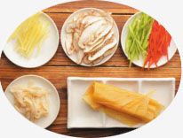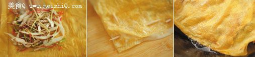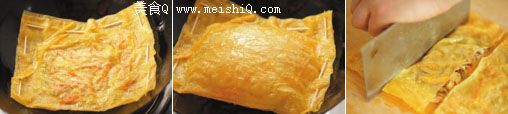取一张油豆皮,平铺在木板上,将炒拌好的笋丝、青椒丝、红椒丝和香菇丝均匀撒在油豆皮上,然后再覆盖上另一张油豆皮。