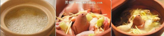 汽锅鸡,因用汽锅蒸制而得名。主要食材是鸡肉,主要烹饪工艺是煮,有补虚养身、补血、健脾开胃的功效。汽锅鸡是云南的名菜之一,早在2000多年前就在滇南民间流传。建水出产一种别致的土陶蒸锅,叫“汽锅”,是专门用来蒸食物的。汽锅鸡的做法是钭仔鸡洗净后在砍成小块,和姜、盐、葱、草果一道放入汽锅内盖好,汽锅置于一放满水的汤锅之上,用砂布将隙缝堵上,以免漏汽,再放到火上煮。汤锅的水开后,蒸汽就通过汽锅中间的汽嘴将鸡逐渐蒸熟(一般需3 ~4小时)。由于汤汁是蒸汽凝成,鸡肉的鲜味在蒸的过程中丧失较少,所以基本上保持了鸡的原汁原味。