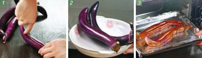 将切好的茄子放进微波炉,用高火加热 3分钟后取出,再放入 190℃预热的烤箱中烤制 10 分钟。