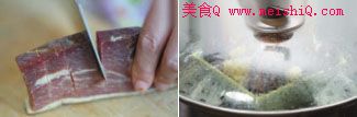将金华火腿上方部位切成大方块,然后将其皮朝下放在砧板上,用刀剞小方块,深度至肥膘一半处。