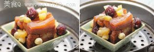 皮朝下放盘中,加入清水没过肉块,蒸锅内加足量水,蒸约 2 小时后取出,卤汁倒于碗内。