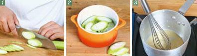 将丝瓜洗净去皮,切成厚度 3mm 左右的片,然后整齐地码放在烤盆中。