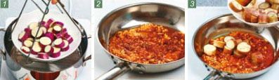炒锅中加热少许香油,倒入八角、蒜末、姜末爆香,放豆瓣酱炒均匀,再入茄子煸炒,炝以料酒,加少许清水焖一会儿,这样更易入味。