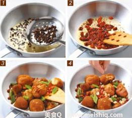 炒锅中放油烧至四成热时放入花椒粒,中火炸香,捞出花椒粒之后,再放入干红辣椒的辣椒籽,待变色后放入干红辣椒,再放入青椒和炒好的猴头菇,加鲜味酱油和糖调味后,最后撒上炸好的花生炒匀即可。