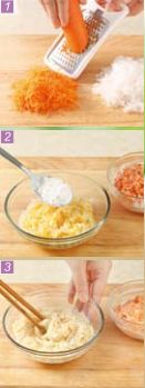 将胡萝卜、白萝卜去皮洗净,用擦丝器擦成细丝,注意选择擦丝器中最细的那个刀孔。擦成丝之后,可以先撒点儿盐,等到水分析出了,再用力挤干。