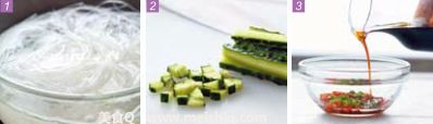 将豆皮上锅蒸一下,或是入油锅炸一下,捞出沥干。同时将粉丝用开水煮软,捞出沥干水分。黄瓜仔细洗净,切碎粒。