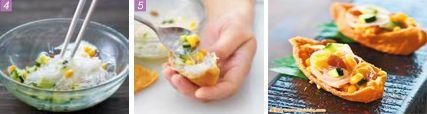 将甜玉米粒、粉丝、黄瓜片和葡萄干混合,淋入调味汁搅拌均匀,放入豆皮中卷好即可。