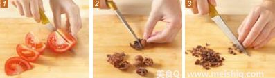 番茄洗净、切块,装入盘中。话梅用小刀削下梅肉,再切成非常碎的碎末。