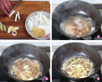 锅里加水,水沸后放入鸡味浓汤宝,倒入牛肉丸(图②),加入姜片,倒入萝卜条煮至萝卜透明至断生(图③)。