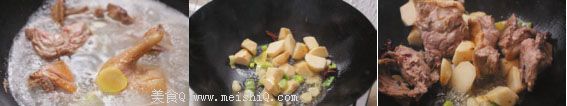 鸭肉切块,冷水下锅焯水,加几片姜,少量料酒,水开后捞出,洗去浮沫。