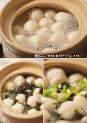 鱼丸半袋、豆腐泡5个、紫菜一点,香油、盐适量
