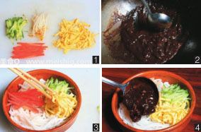 在面条上搁上各色蔬菜和黄瓜丝,再撒入适量肉丁酱(图4),撒上熟芝麻即可。