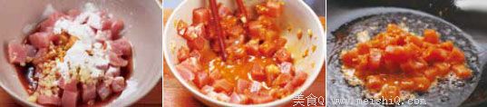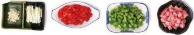 猪里脊肉切末,青辣椒去囊切丁,番茄去皮、除芯去囊、切丁。姜切末,葱切丝。