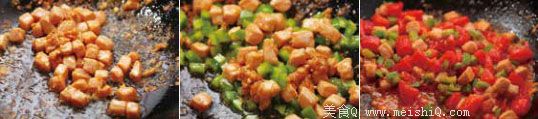 待肉末煸炒变色后加入青辣椒丁,翻炒几下后下入番茄丁一起翻炒;