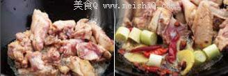 炒至鸡块变白后,放入葱段、姜片、香叶、大料、干红辣椒一起爆炒出香味;
