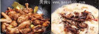 加入水,没过所有食物,大火烧沸后改中火,炖 10 分钟后放入榛磨,再炖 30 分钟,汤汁收浓后,正宗的小鸡炖蘑菇即成。