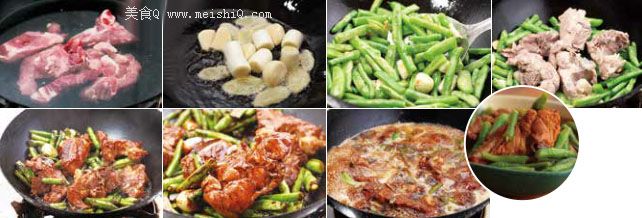 2. 排骨段要切小点,否则不能充分入味。豆角可用新鲜的,不过腌渍的干豆角更有嚼头;
