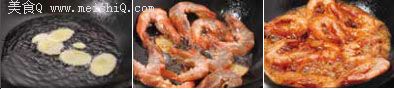 锅中倒油,油五成热时放入姜片煸炒出香味后放虾,在煎的过程中不断用勺子按压虾头使虾脑流出;