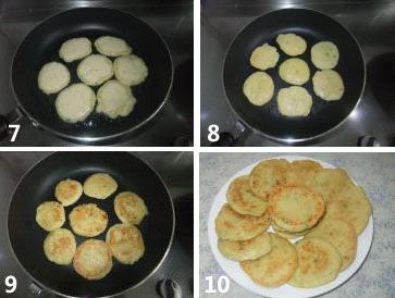 煎锅中倒入油,油温热后,用吃饭用的汤勺舀一勺放入锅中,刚好摊成一个小饼。