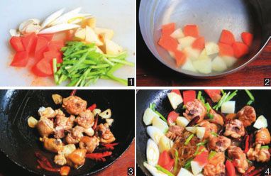 锅中倒入植物油,烧至六成熟时,放干辣椒炒出香味,倒入鸡块翻炒片刻(图3),然后加入蒜片、酱油、白糖继续翻炒。