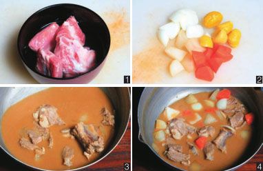 锅中的水分减少后,加入胡萝卜块、白萝卜块、银杏、板栗以及另外一半调味料,继续烹煮20分钟,再将排骨放入酱汤中(图4),煮至排骨变色即可。