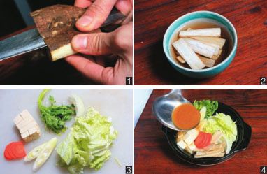 洋葱洗净,去皮,切粗条状;青葱切斜段;春菊、大白菜切段;胡萝卜洗净,去皮,切片;豆腐切小块(图3);金针菇洗净,去根;鲜香菇洗净备用。