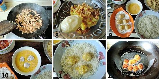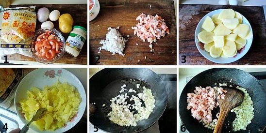 将调好味的虾仁段和土豆泥混合均匀,再加入白酱,最后再加入蛋黄沙拉酱拌匀调整湿度。