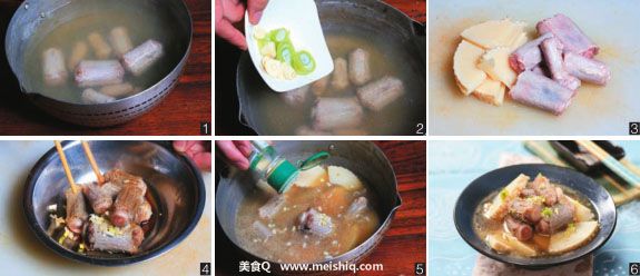 把汤再熬一次,并放加佐料的牛尾、笋块煮熟盛在碗中(图5),另放上准备好的葱,加入盐、胡椒粉、鸡精调味,盛出(图6)即可。