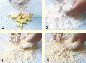 将过筛的面粉与黄油、盐混合,双手将面粉和硬的黄油丁揉搓成小颗粒,使黄油颗粒均匀地分布在面粉中,并且还是松散的状态。