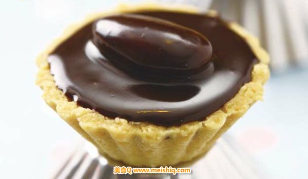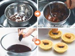 大杏仁粘上少许熔化的巧克力后放在塔表面,然后再浇一层熔化巧克力液,放入冰箱冷藏10分钟至巧克力酱定型即可。