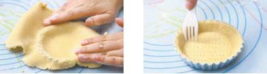 将派皮擀成厚0.3cm的片状,将面皮衬入模具,用手按压派皮,将面皮均匀的贴住模具的内部。