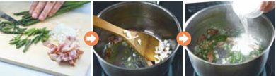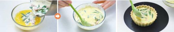 培根切块,芦笋切段,洋葱切末。炒锅热后直接小火煎熟培根,再放入洋葱和芦笋煸炒,然后依次放入淡奶油、牛奶、盐和黑胡椒,稍微搅拌关火放凉一会。烤箱再调至190度。