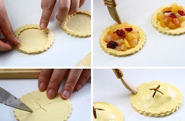 底下的面皮周围刷蛋液用以粘贴,中间放入苹果馅后,顶面的中间横划几刀用以透气。将两面盖好,并把四周封严。