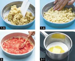 将材料A中的黄油在室温下放软,然后所有材料混合,搓成酥粒状,在模具底部按平实。