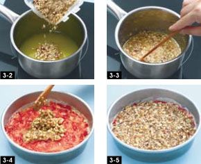 将室温软化后的黄油、砂糖和牛奶放入准备好的不锈钢小锅中,以中火加热变成金黄色时加入D料中的果仁碎,混合均匀后倒入果酱层上,均匀铺满一层。