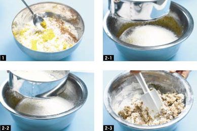 将A料的熔化黄油、红糖、糖粉混合拌匀,再加入B料的鸡蛋、蜂蜜、牛奶,拌均匀。