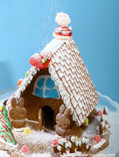 等房子完全固定了,用剩余的糖霜将各种五颜六色的卡通的糖果装饰在房子的四周,如果有多余的饼干,可以围城栅栏的样子也很有气氛,最后筛上糖粉即可。