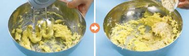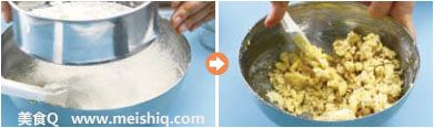 将A料中的黄油和糖粉混合,用打蛋器打至松发,然后加入蛋黄,搅拌均匀备用。