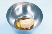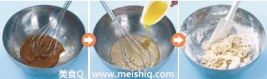 将熔化的黄油温热时倒入鸡蛋牛奶液中,然后将C料混合过筛加入到黄油鸡蛋牛奶液里,混合揉成面团。
