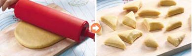 将松弛好的面团用擀面杖擀成厚1厘米的片状,然后将其切成等大小的三角块。