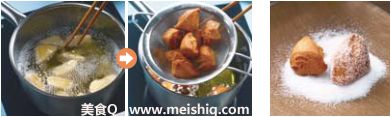 锅中倒入植物油,烧至六成热时放入三角块,不时翻面,尽量两面上色一致,等三角块表面不再冒泡、颜色深黄,捞出沥油。