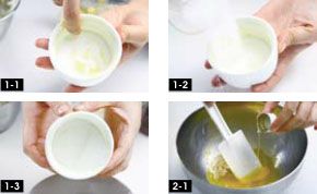 将C料中的黄油熔化,加入到蛋黄面糊中,将其充分搅拌均匀。
