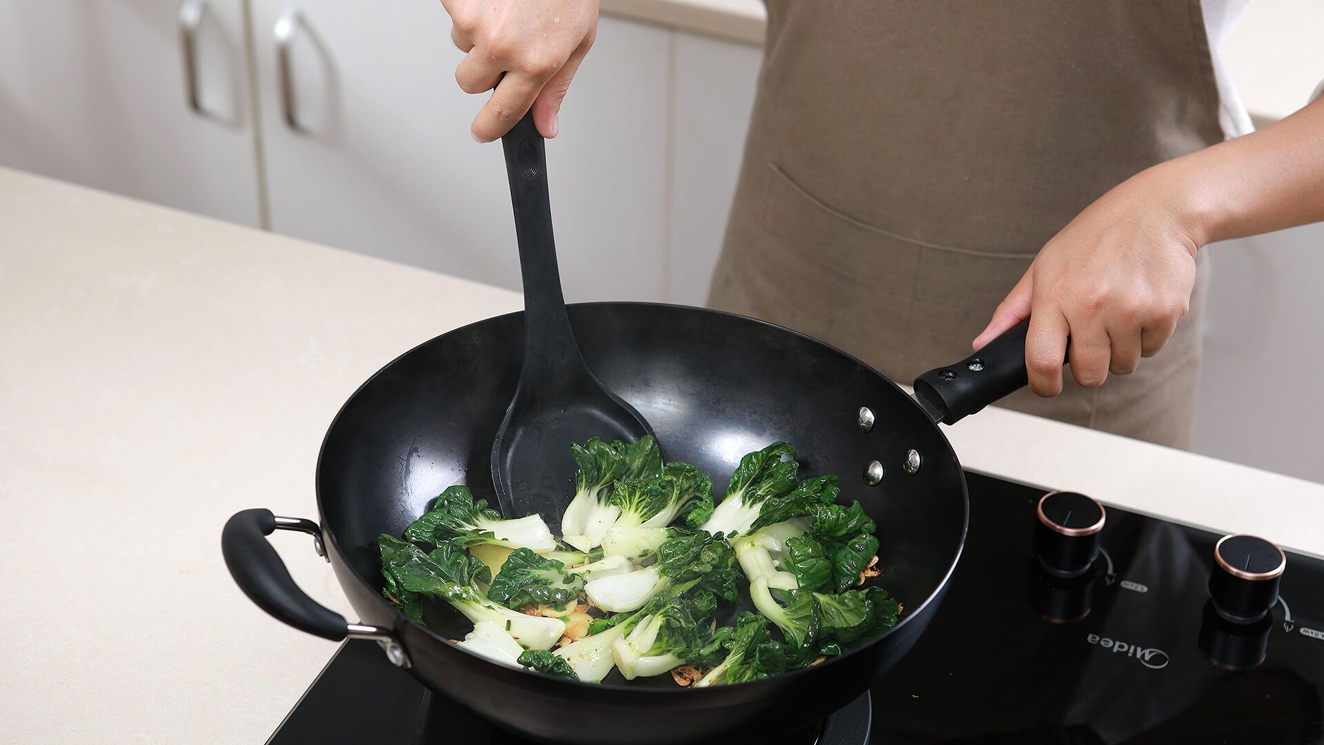 倒入小白菜翻炒,小白菜断生后加入虾皮,待小白菜炒软后倒入耗油与鸡精,翻炒均匀后加少量盐即可。