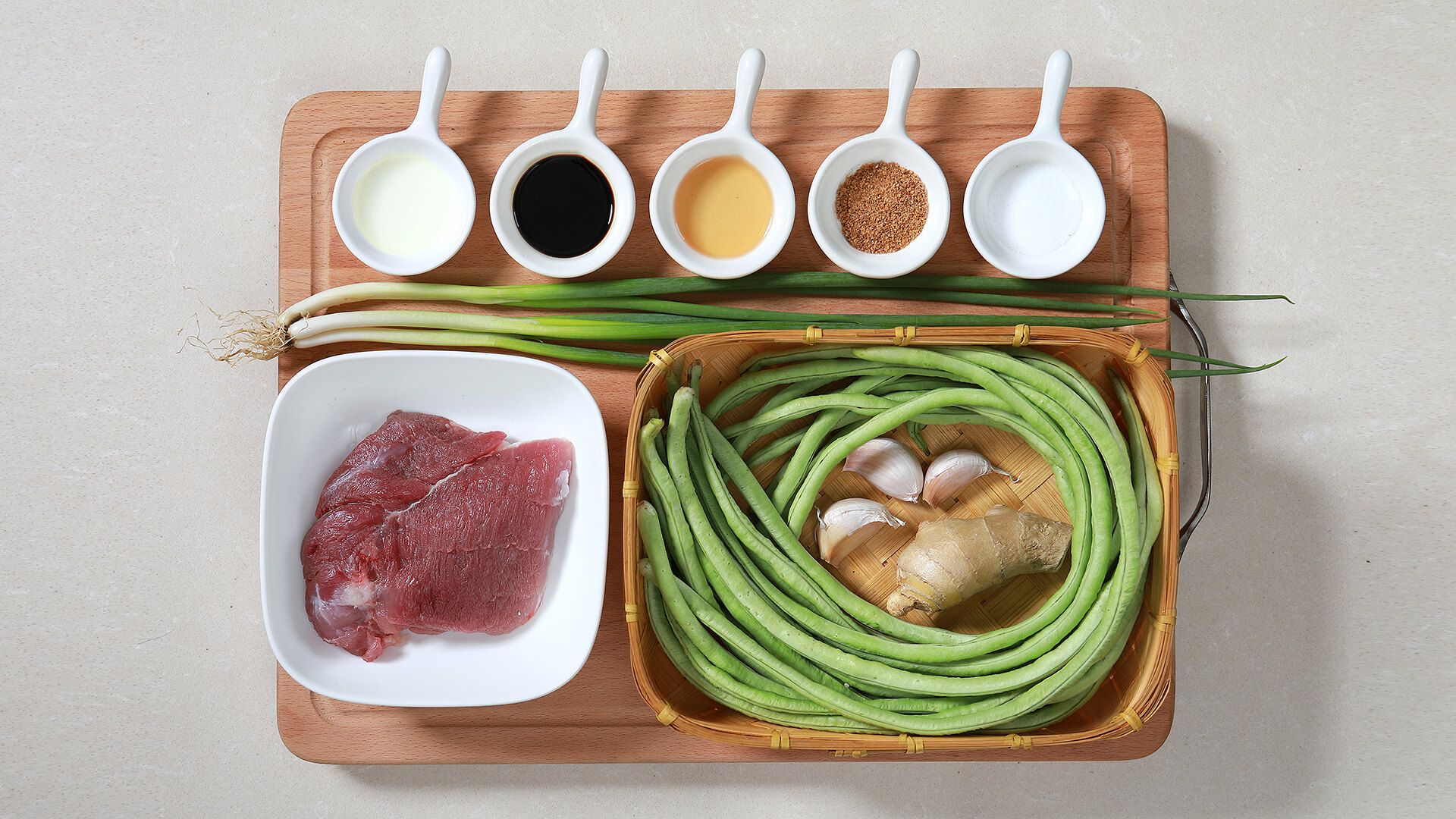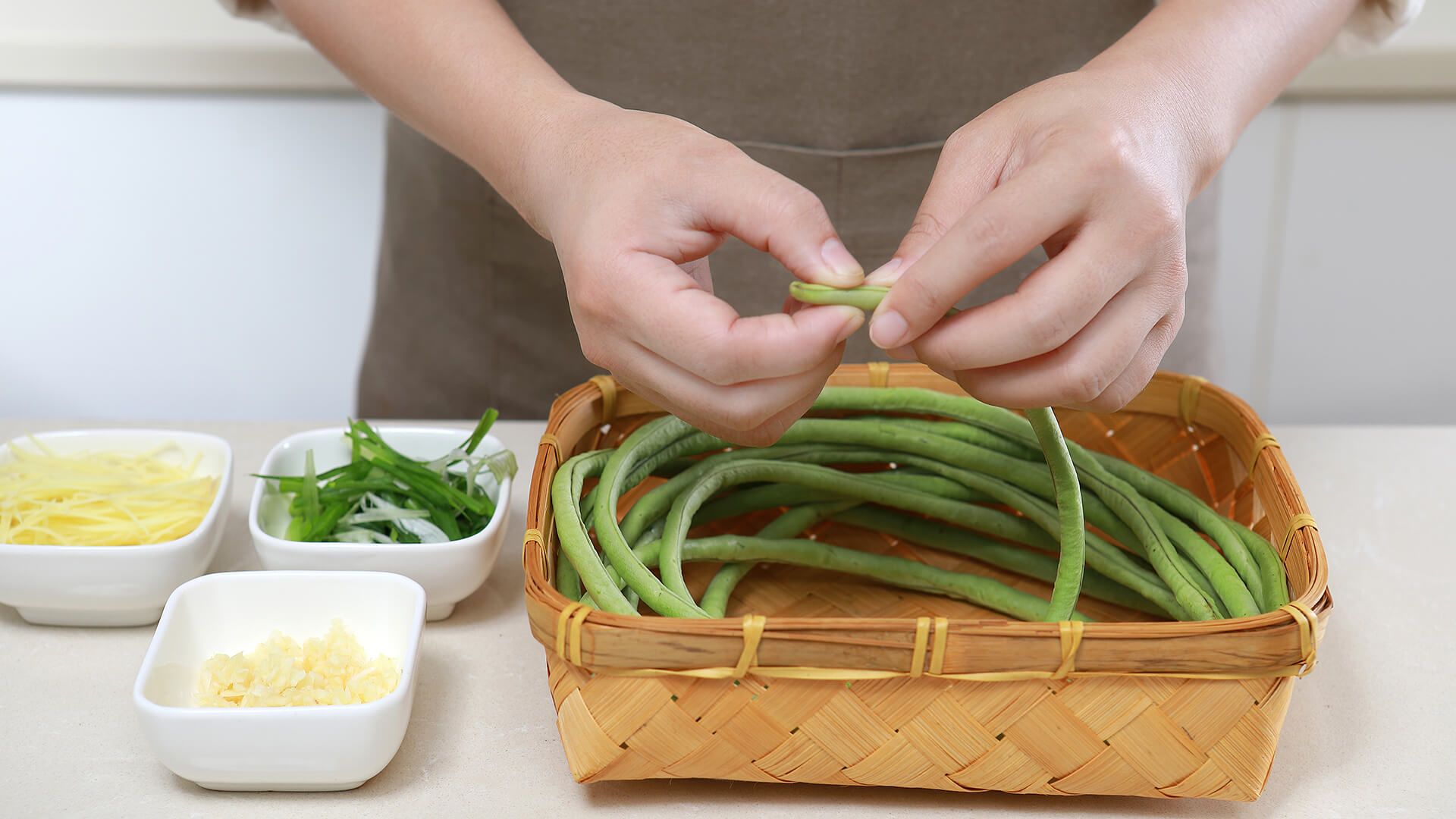 豇豆去头掐尾,清洗干净,切成2厘米长的寸段,放入碟中备用;葱切粒,姜切丝,蒜切末,肉切细丝备用。